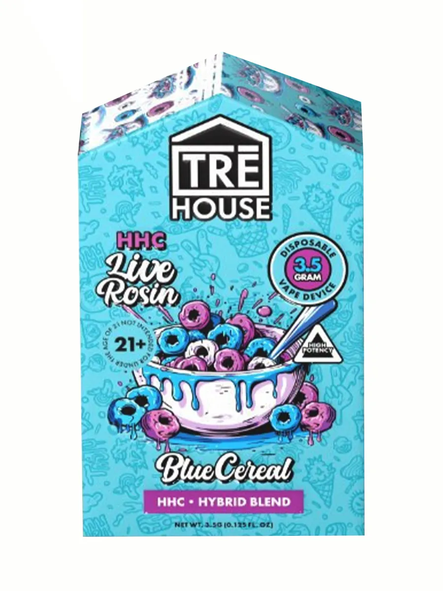 Shop now and enhance your experience with the Blue Cereal TRĒ House HHC Live Rosin Vape Pen 3.5G!