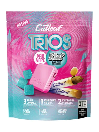 Sweet fruit meets dessert comfort with the Cutleaf Trios Kief Loaded Pack. Blending the juicy brightness of Fruit Punch with the smooth richness of Euphoria Cookies, this set delivers variety and balance in every session. With gummies, a vape, and kief-loaded pre-rolls, it’s crafted for those who want flavorful diversity and satisfying potency in one package.
